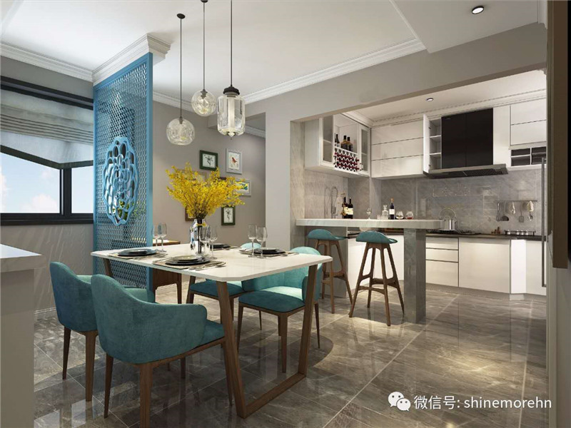 吧臺隔斷 廚房除了推拉門以外,喜歡開放式廚房的朋友則可以選擇做個小吧臺,它可以成為用餐區,這樣一來不僅好看而且更好的提高了空間利用率。