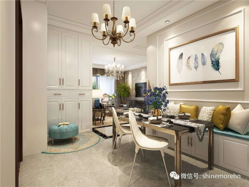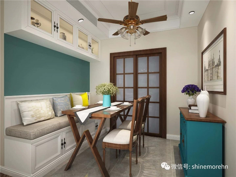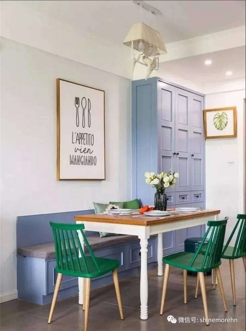 浪漫有情調的餐廳,墻面的收納柜的設計讓餐廳兼具儲物的功能。