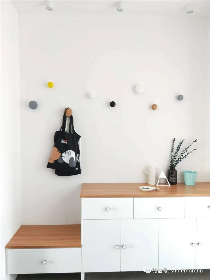 玄關(guān)墻上具有裝飾意義的彩色木掛鉤同時(shí)兼?zhèn)鋺覓旄鞣N出門必備的包包,衣物等物件的功能性。