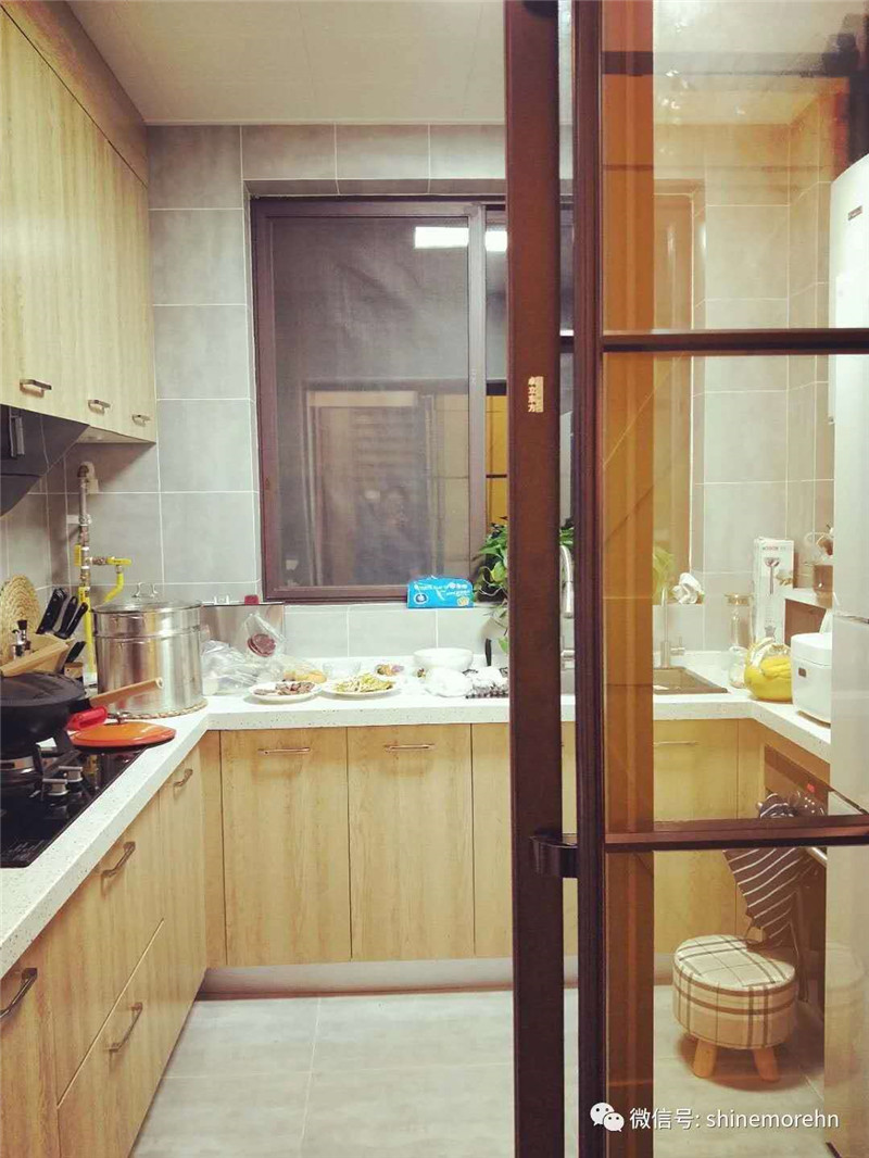u字型的廚房空間設(shè)計(jì),原木色的櫥柜搭配水泥灰的墻磚,整體顯得空間和諧統(tǒng)一。