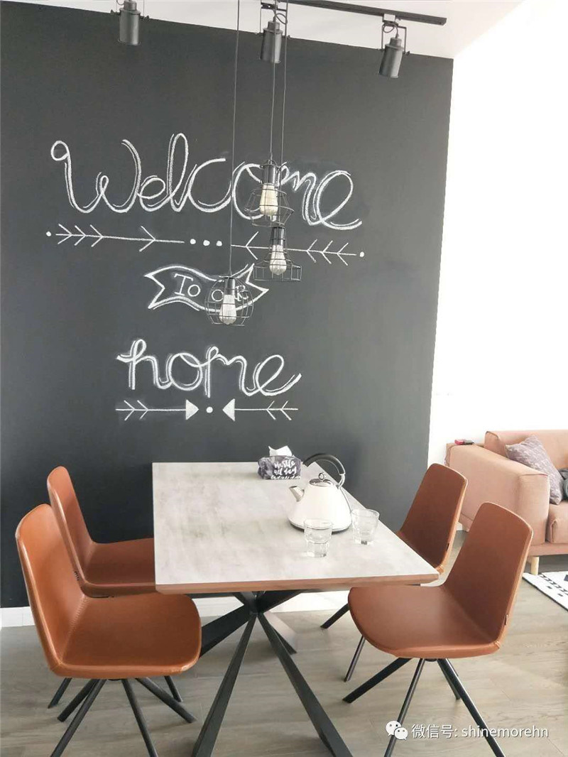 餐廳整體的氛圍非常簡(jiǎn)潔舒適,以北歐原木餐桌椅,餐廳背景墻為一面黑板墻,可以隨意涂鴉,情調(diào)美觀又溫馨。