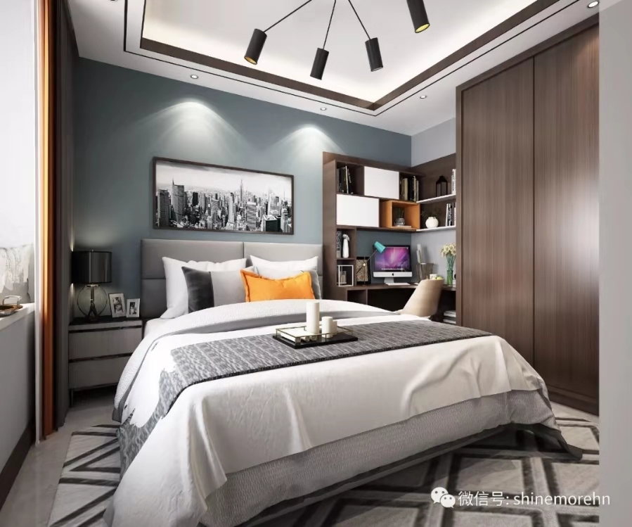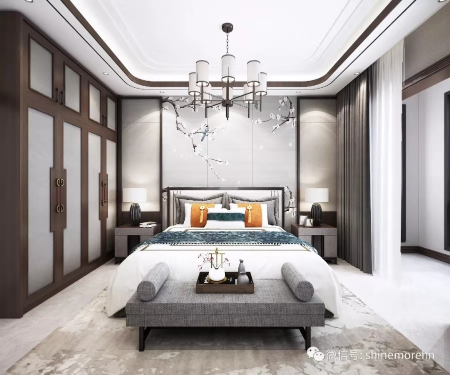 “ 臥室床頭用水墨畫作為背景,衣柜做一體式柜,整體淡雅儒家風范。