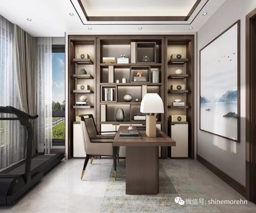 “ 書房整體以沉穩(wěn)的木色為主,給人寧靜而致遠的感覺,線條簡潔明了而又韻味十足。