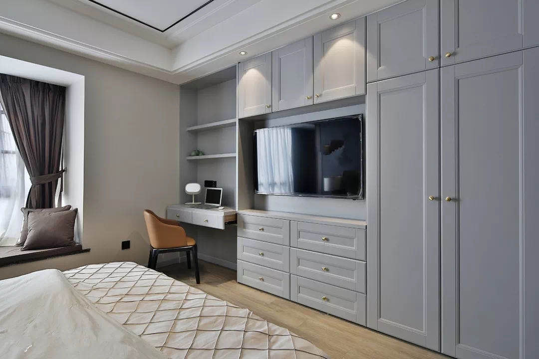 衣柜內部分區,通常是將頂部不好拿取的部位設計成被褥區,用來收納棉絮、被套。中間留空的區域分部設計疊衣區(短袖、短褲等),上衣區(易皺的衣物,如西裝、襯衣等)、底部再設計掛褲子的褲架區,以及收納小件衣物、襪子等的小抽屜。當然,如果您家里衣柜空間大,也可以單獨將男女主人掛衣服的區域分開,這樣拿取會更方便。