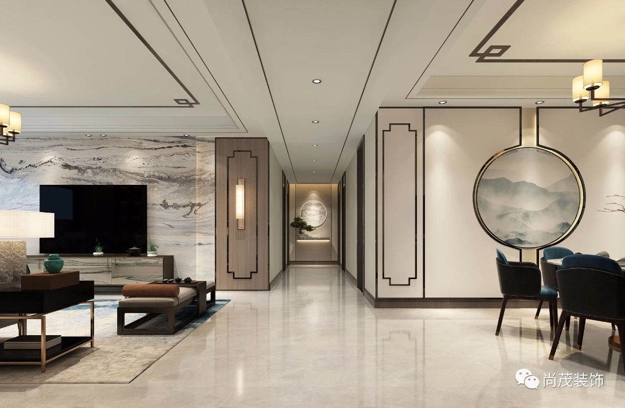 客廳吊頂跟餐廳一致,這樣做更加協(xié)調(diào)統(tǒng)一,由于電視背景墻較長,采用分段的形式來做,柜門更是以設(shè)計感較強的山水畫來做。
