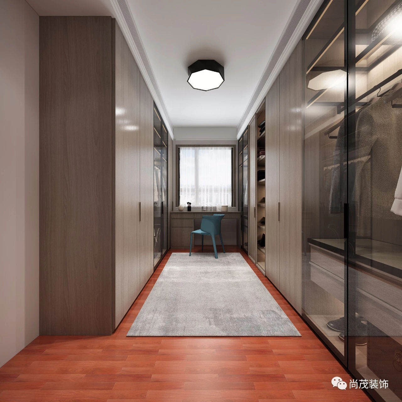 其中一間臥室改成衣帽間,增大了整個空間的儲物,雙排的衣柜做了通頂設(shè)計,簡潔整齊,超級實用的衣柜完全滿足了女主對儲物的需求。