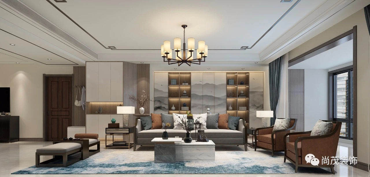 沙發(fā)后面利用書柜的形式來做,柜門更是以設(shè)計感較強的山水畫來做,柜門關(guān)上之后,會給人視覺的沖擊感。
