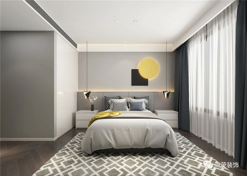 老人房延續了主臥的色彩搭配,但是設計師在背景墻部分動了點小心思,下半部分采用淺色系大理石,使老人房區別于主臥,比主臥多了一份素凈,更適合老人居住。