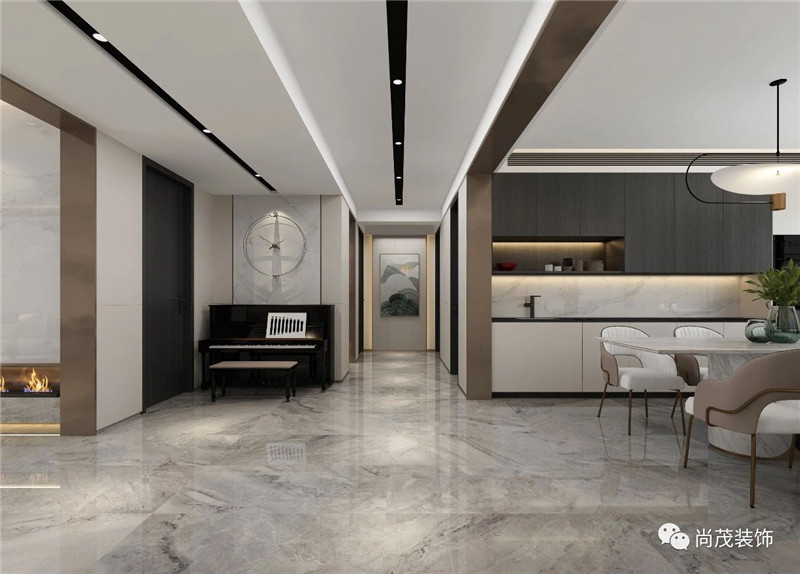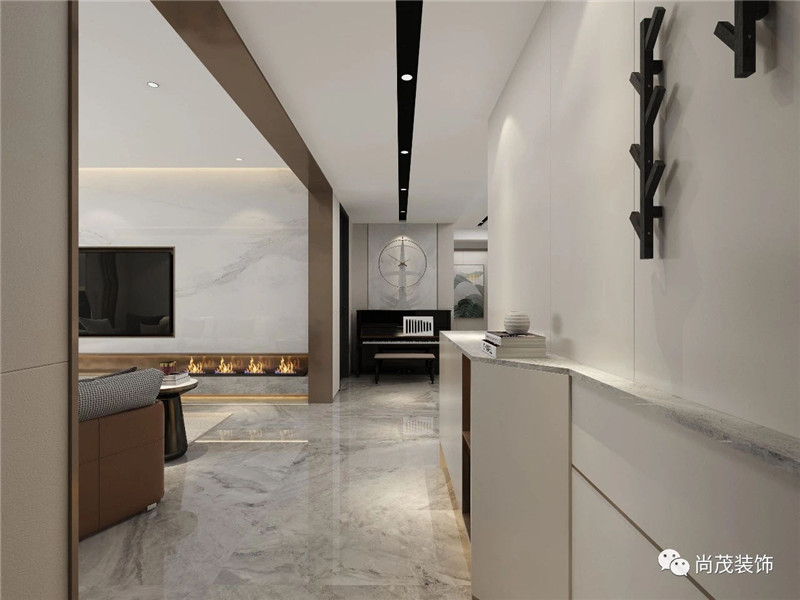 入戶玄關處設計為不規則的臺面,從進門處延伸過去,使空間有一種縱深感,同時又不阻礙通行,視線從臺面延伸過去就是鋼琴區。