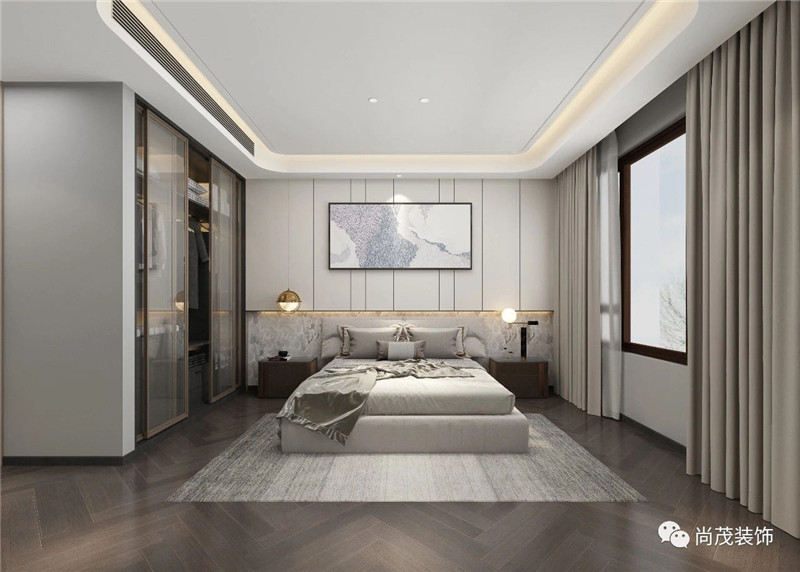 主臥整個區域采用無主燈的設計,減少裝飾的繁復;用燈帶、筒燈等光源的組合搭配來達到視覺上的延伸,營造不同生活場景的光影氛圍。棕褐色的實木地板,衣帽間相同色系金屬邊框玻璃門,使整個空間呈現出一種沉穩大氣的氛圍,簡約而有質感,體現出主人的生活態度。