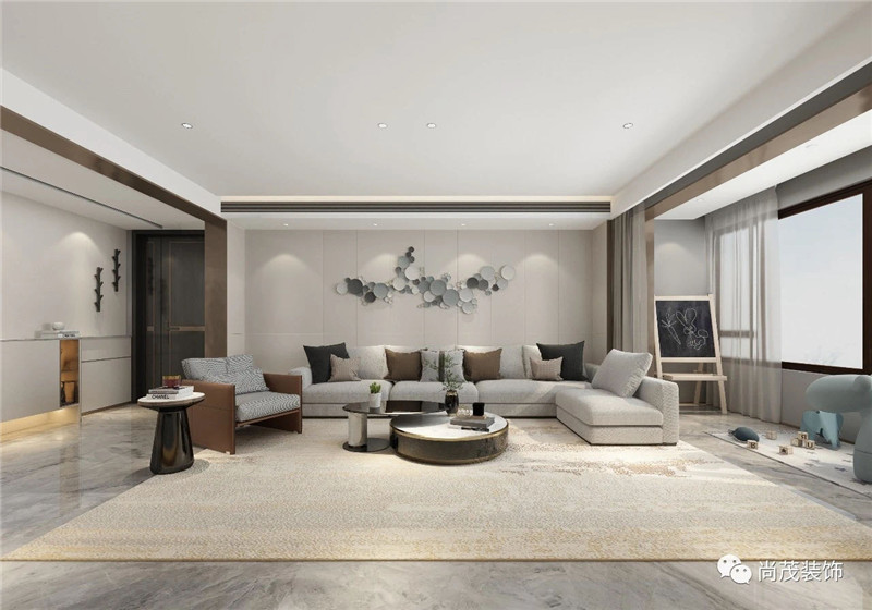 整體空間以米白、灰、褐色為主色調,沉穩的氣質浸染到居住者的日常,簡約、放松、慵懶,色彩上做減法,不同程度的灰色系呈現出空間細微的層次變化;地磚及大理石桌面的光潔和反射,增加了空間的通透感。業主要求有專門的洗衣房,洗、烘設備齊全,所以設計師把陽臺設計為純休閑空間,為孩子們預留出玩耍空間。休閑陽臺與客廳用大地磚通鋪,兩者銜接在一起,使視野更為通透。