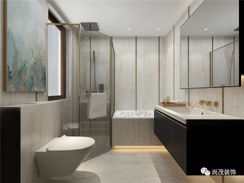 下班回到家在浴缸里泡一下澡,驅散一天的疲憊;嵌入式馬桶、浴室柜不與地面接觸,不留衛生死角,更容易清洗;防潮石膏吊頂,簡約美觀。