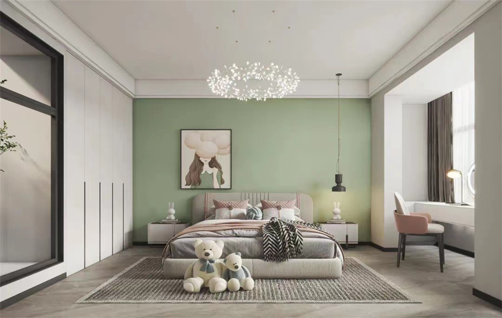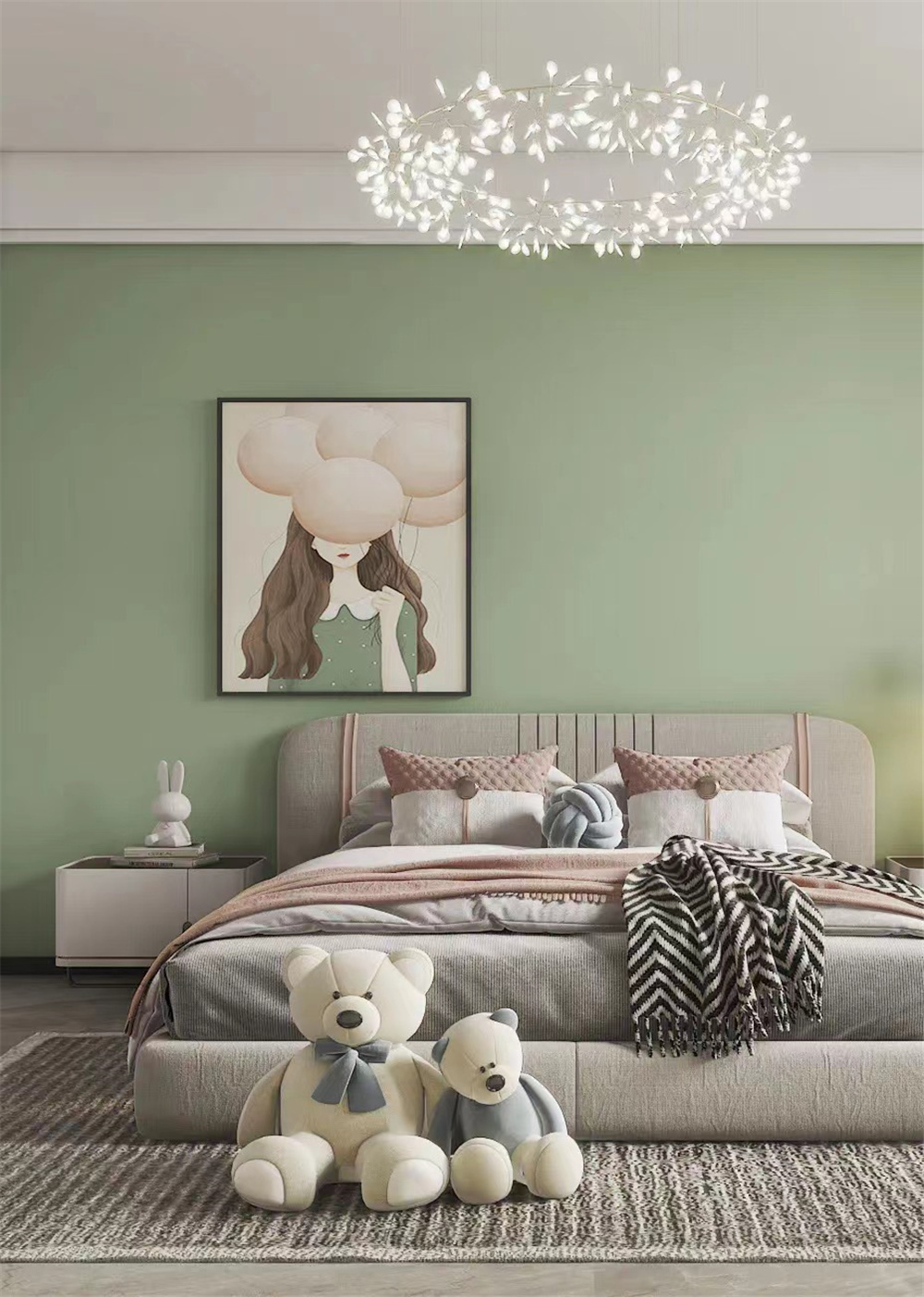 兒童房是孩子的樂園,充滿了藝術的創造力。女孩房以春綠為主色調,簡約的掛畫,夢幻的螢火蟲燈,軟糯的毛絨玩具,不論哪個都是女孩子細膩的愛,營造了一個小女生安靜清雅的空間。