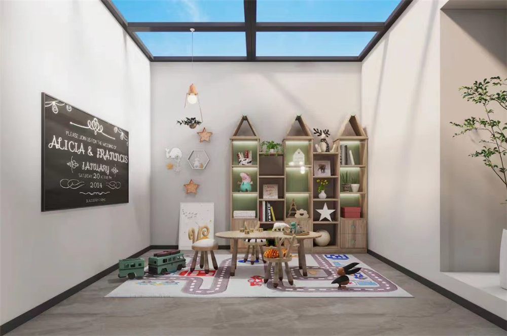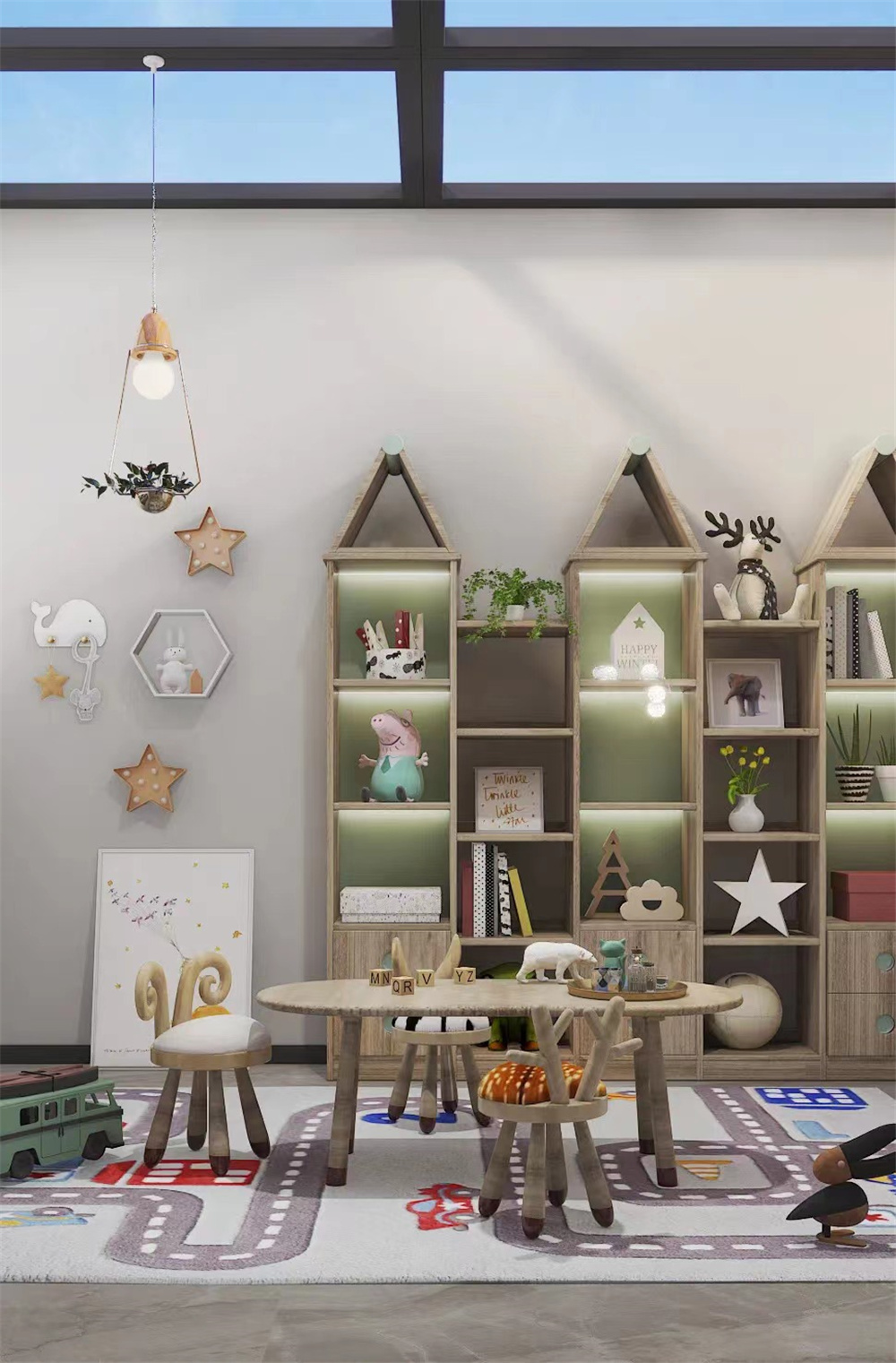 The public area on the second floor is specially left to create a children's entertainment area for children. Bookcases in cartoon shape, tables and chairs in deer shape, dolls and building blocks that babies like can be ripe here, protecting children's childlike interest and innocence, and satisfying the parent-child interaction function that the owners want.