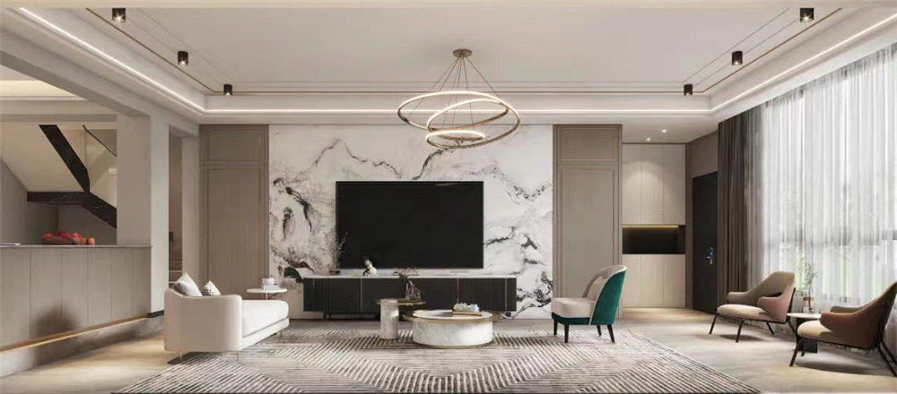 客廳最能代表一個家的審美格調,電視背景墻設計靈感加入了中國風的水墨石材和木飾面結合,以傳統文化的內斂沉穩為出發點,融入現代設計語言,為空間注入了唯美的古典情韻。沙發背景墻氛圍燈的虛化提升空間格調,同樣是中國水墨畫的元素與電視背景呼應,傳遞了業主情有獨鐘的中國風情節。 The living room can represent the aesthetic style of a home, TV background wall design inspiration to join the combination of Chinese ink stone and wood veneer, with the traditional culture of introversion and stability as the starting point, into the modern design language, for the space into a beautiful classical charm. The void of the atmosphere lamp on the sofa background wall improves the space style, and the elements of Chinese ink painting echo with the TV background, conveying the owner's favorite Chinese style.