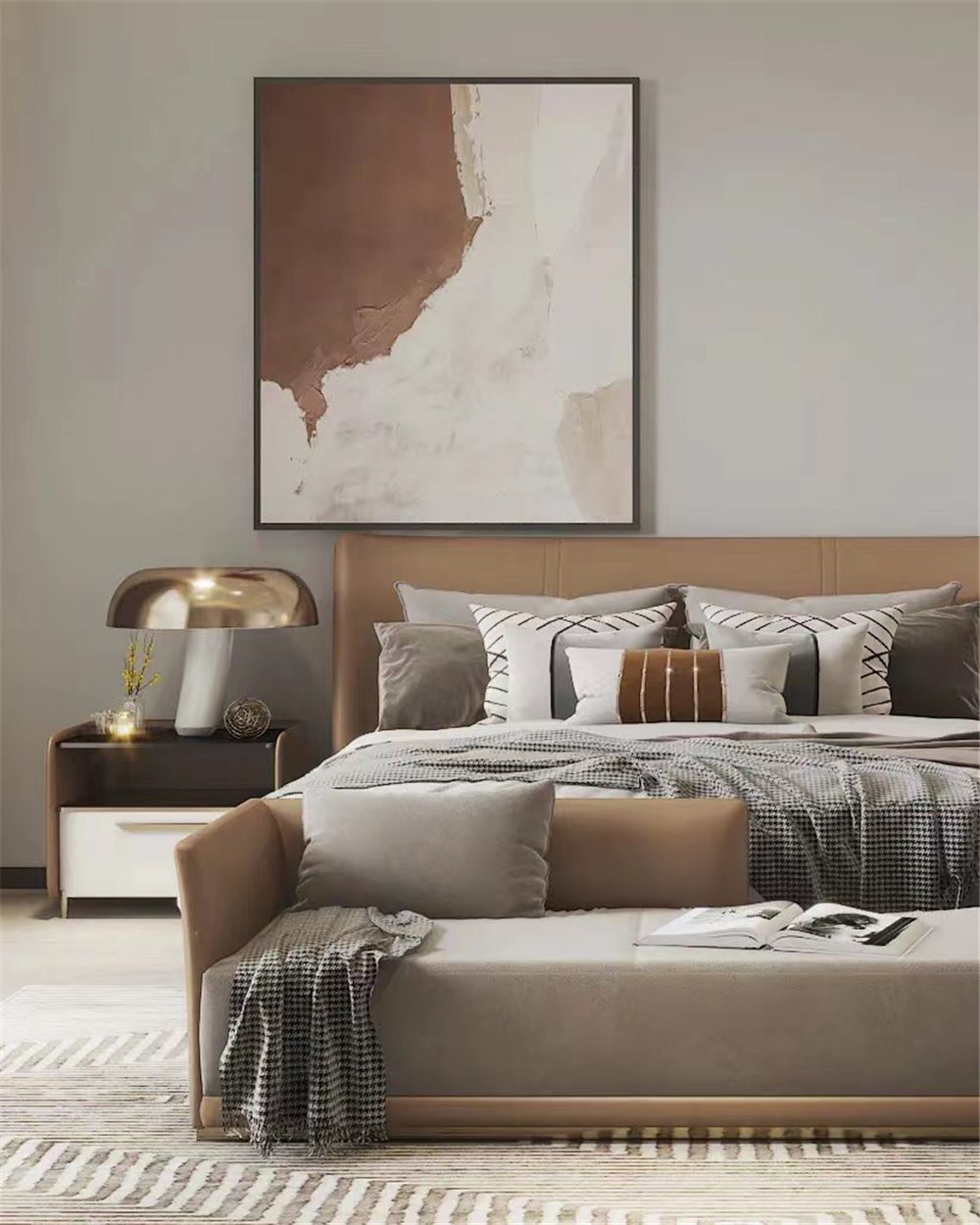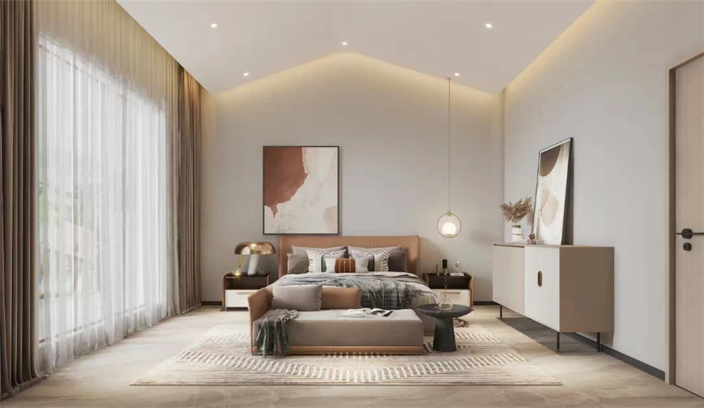 主臥室以米灰+橙的大地色系,加上金屬元素,形成精簡雅奢的視覺體系。營造簡約的生活主張,低飽和度的深淺色階巧妙過渡,軟裝奢華的質感包裹整個睡眠空間,凸顯簡約又不失對于品質生活的追求。