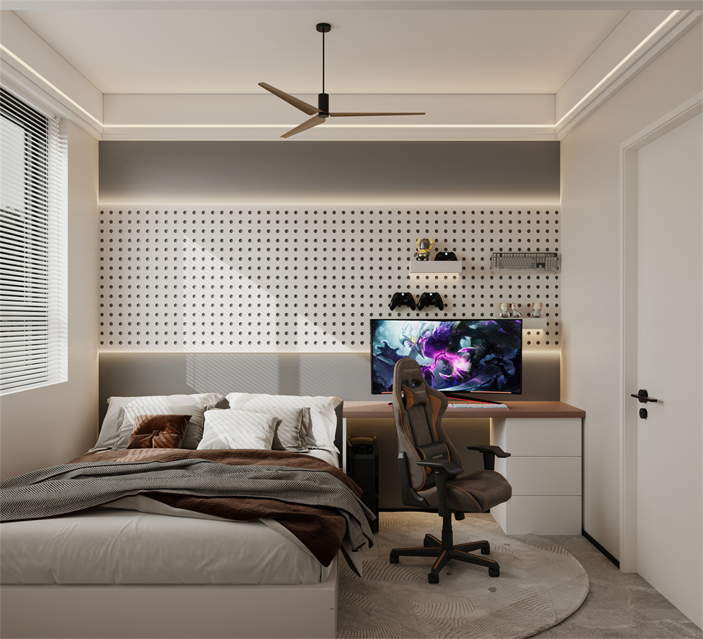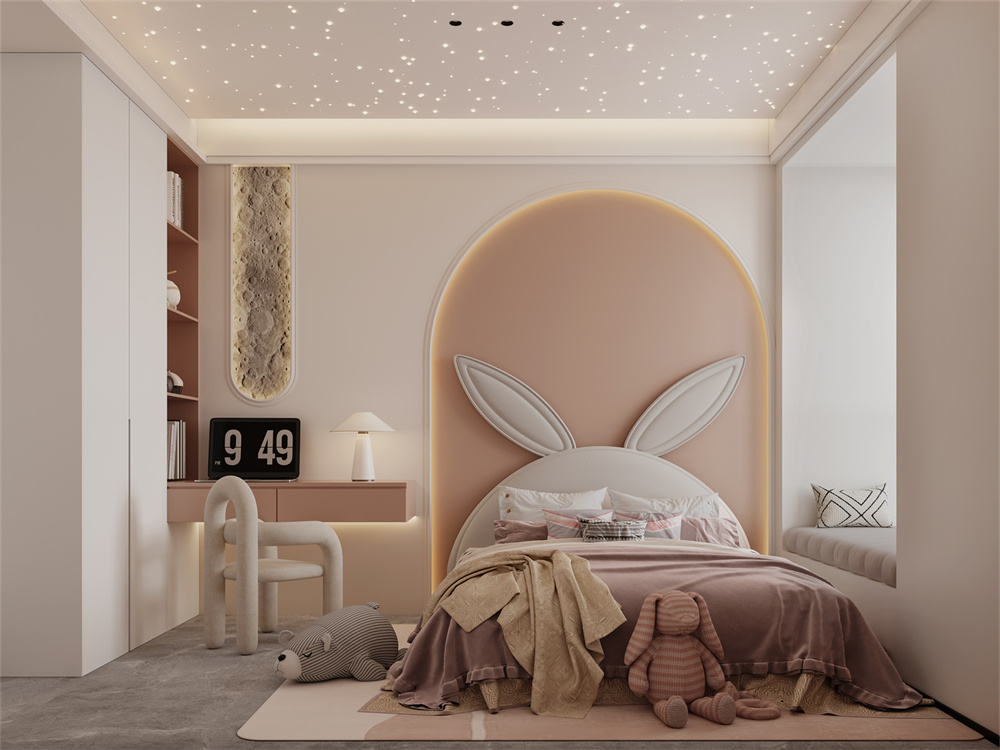 小朋友們總是對世界充滿著無限的好奇與想象。女孩房在主色調的基礎上增添了粉色用以裝飾,用色彩傳遞情感,浪漫唯美的粉色將藝術氣息帶入,充滿未知與想象力。