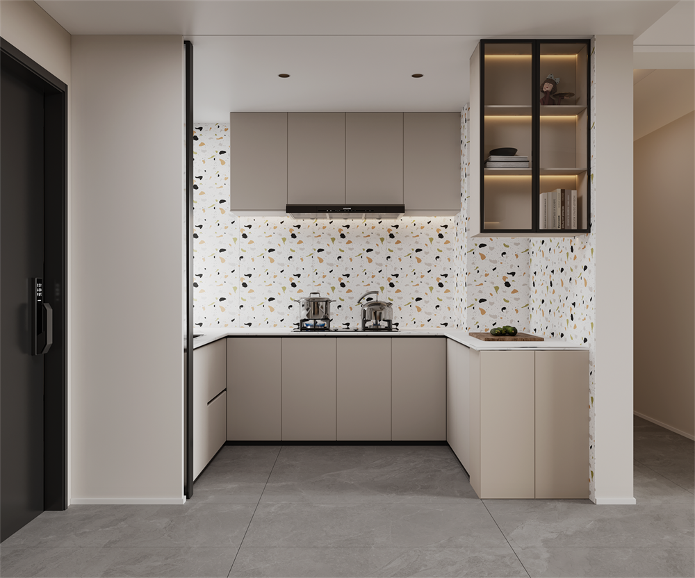 打掉入戶旁邊的墻體做成了開放式廚房,極大地增加了入戶的空間感,廚房的小花磚的設計也為入戶增添了一抹色彩,在這樣的廚房做飯也是一種享受。