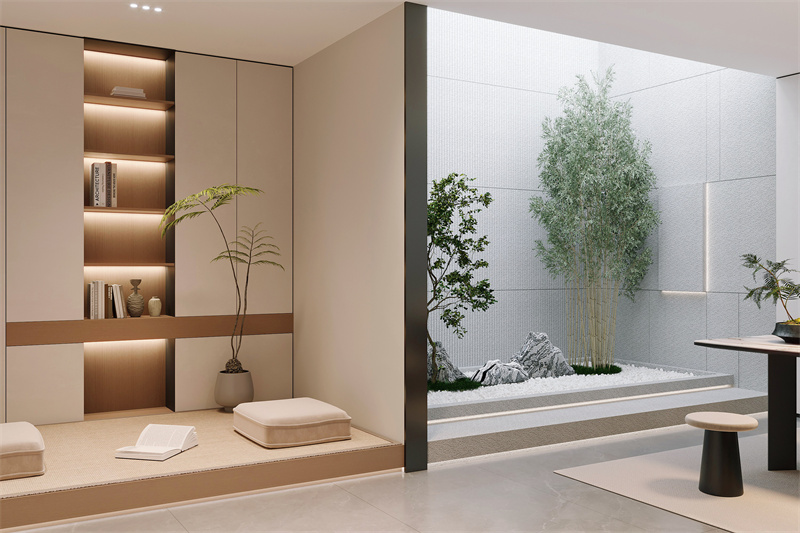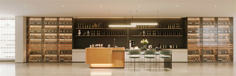 天井改茶室,一抹陽光射出,讓整個地下室平添了宋詞里的意境!優雅茶間后面一組有意境的展示柜,以造型各異的陶瓷茶具渲染傳統文化氣息。瓷器的味道和茶的香氣互融,給予更深層次的文化韻味。