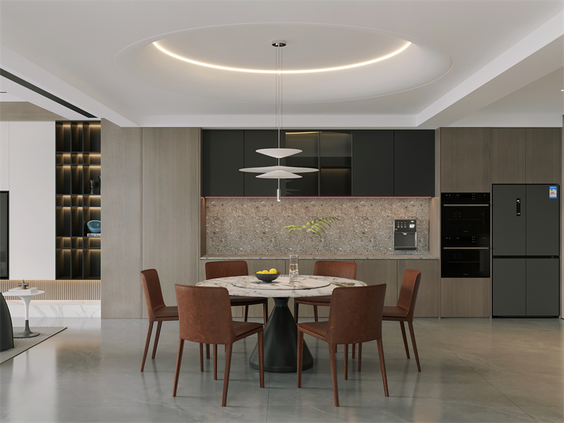 圓形的餐桌搭配餐邊柜和冰箱一體嵌入式設計,不但動線舒服,還能在視覺上看上去更加大氣簡約!