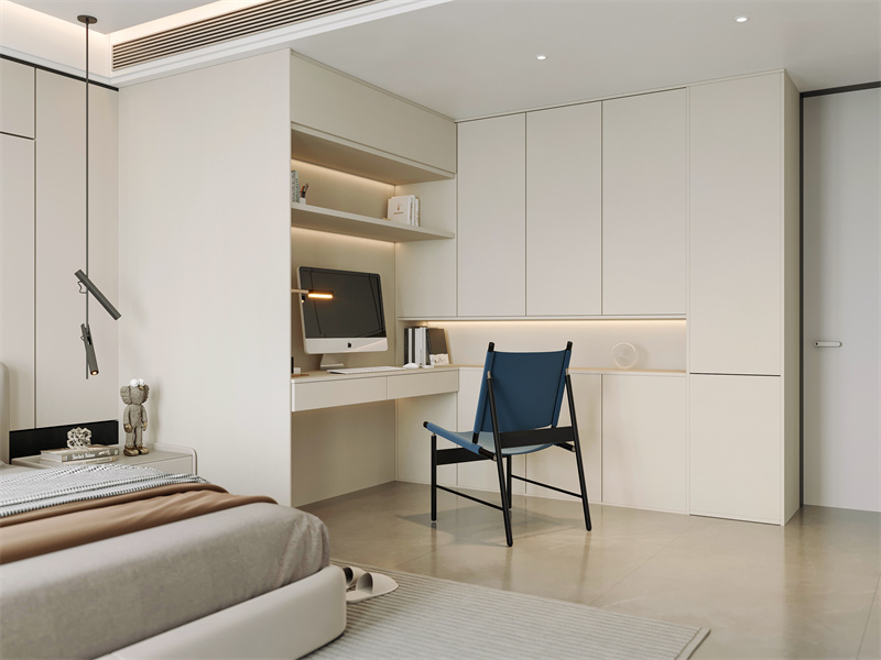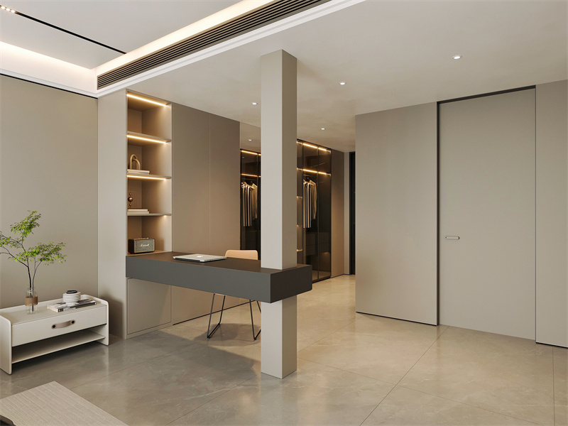 臥室遵循極簡主義,減少繁瑣的裝潢,致力于打造舒適的睡眠環境,富有藝術氣息和觀感,一個回歸自然之美的角落,沒有繁華與張揚,只有恬靜與素雅。家具和諧而靜謐安然,其溫潤的材質、謙遜的色調,便得以融入這個沉靜的氛圍中。