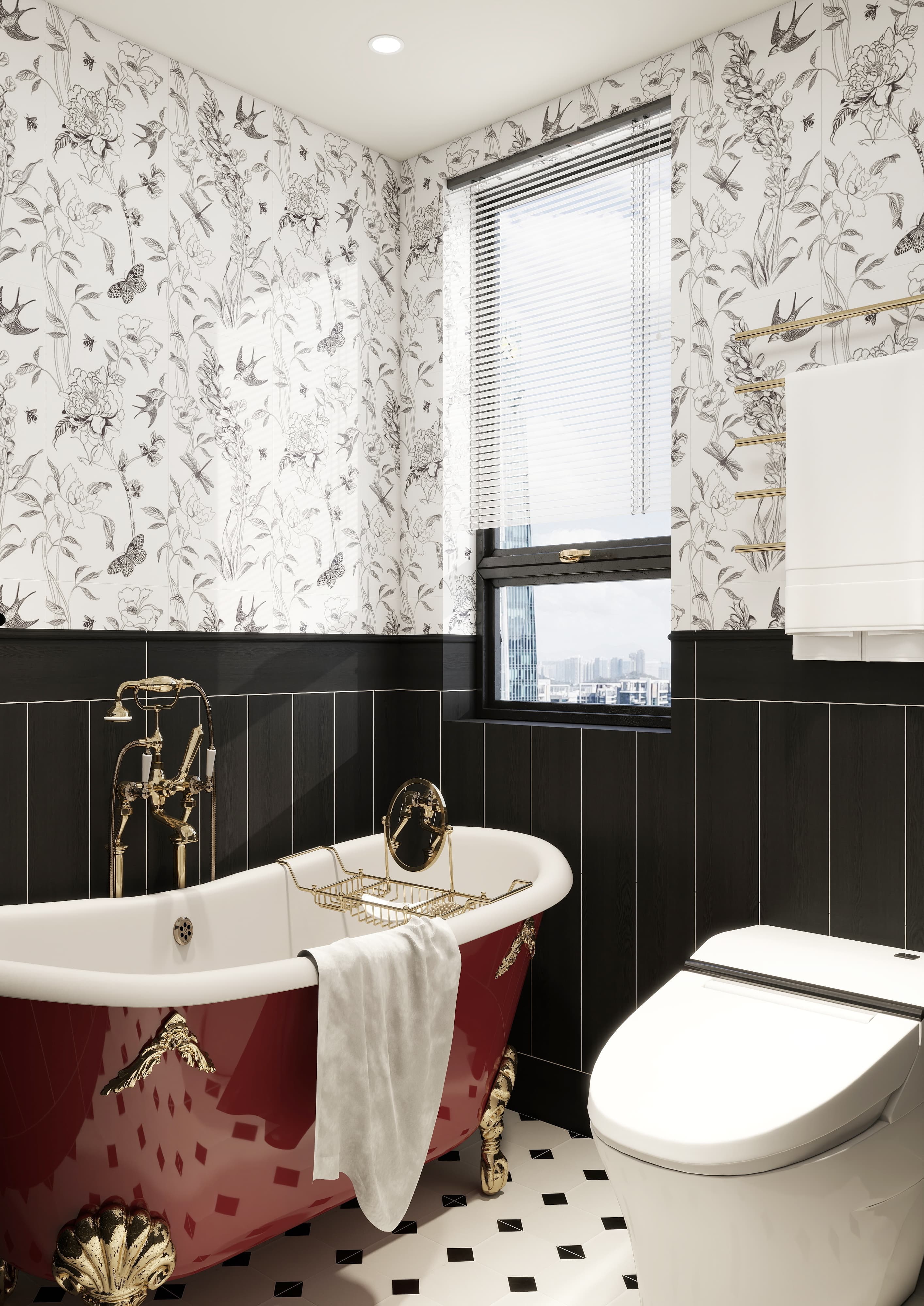 主衛(wèi)生間設(shè)計(jì)師選擇花磚和黑磚組合,個(gè)性十足又充滿了藝術(shù)感;而那一抹鮮艷的紅色浴缸瞬間成為整個(gè)空間的焦點(diǎn),這樣的搭配讓衛(wèi)生間不再單調(diào)沉悶,泡在紅色的浴缸里,仿佛置身于夢幻的世界。