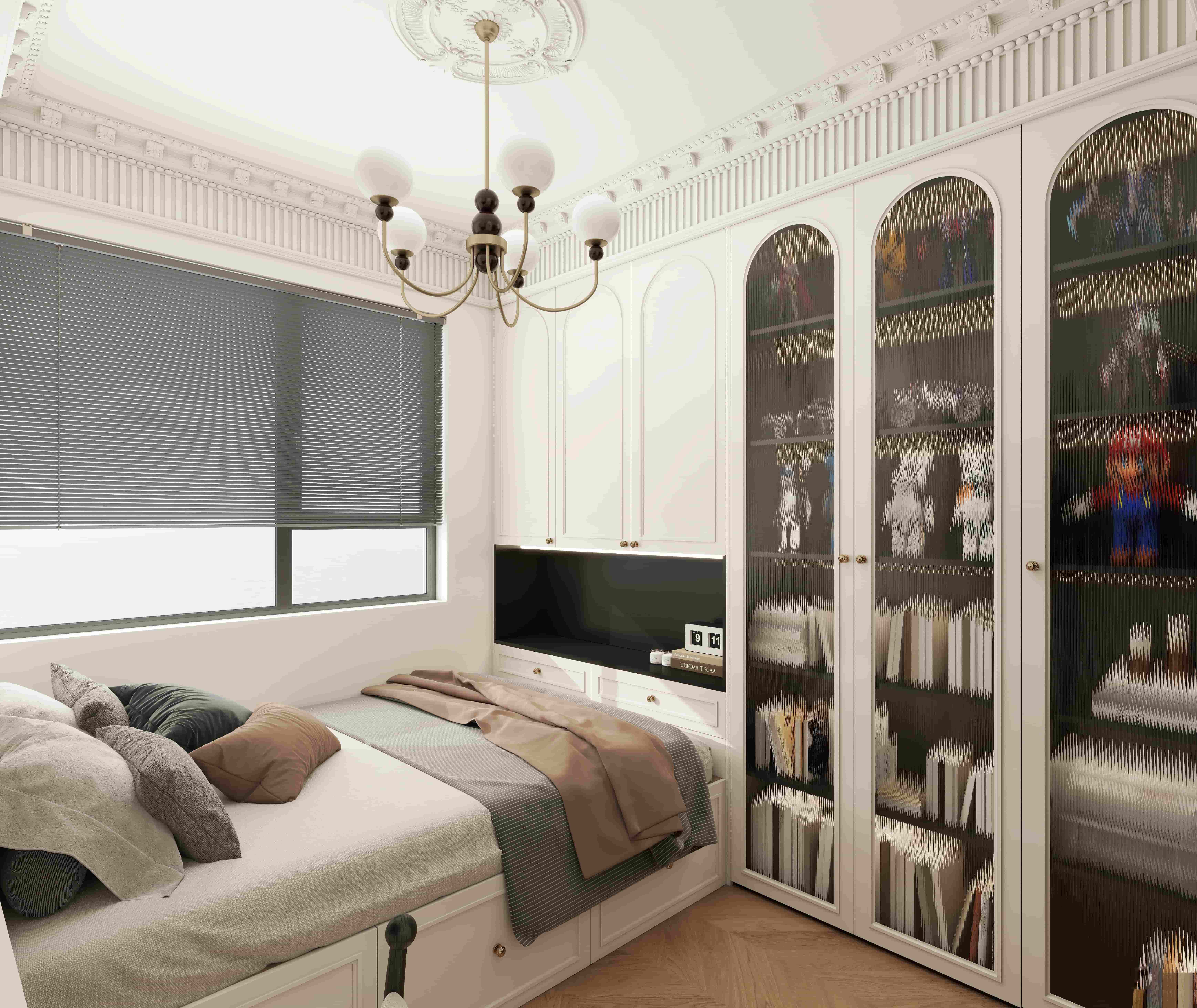次臥室采用了榻榻米的形式,這樣空間感和收納都很最大化,吊頂和柜子做了很好的結(jié)合,精致的雕花和線條也增強(qiáng)了空間的立體性和層次感,色彩柔和,空間舒適,無論是誰在這樣的空間休息都能做一個(gè)好夢!