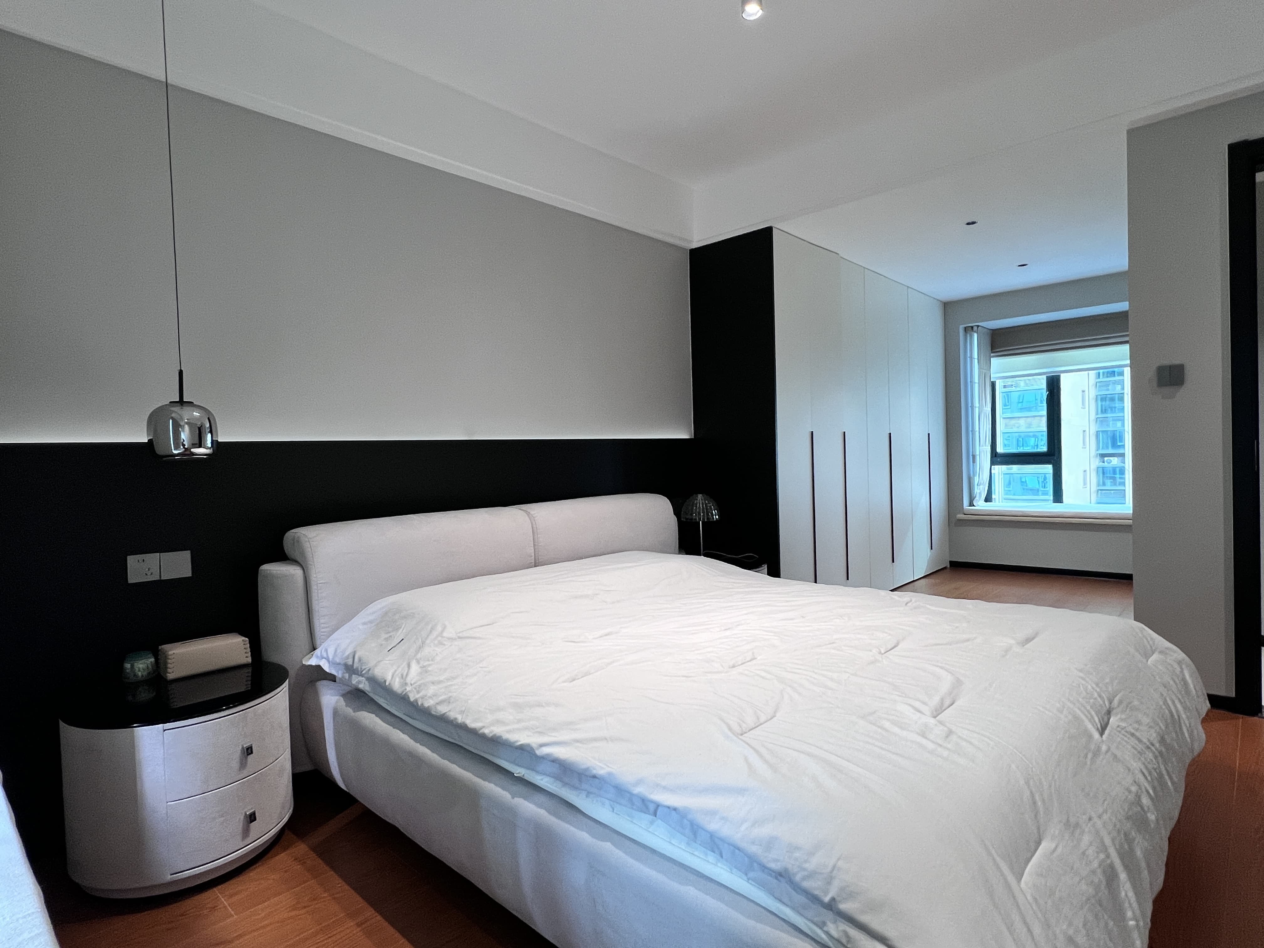 改造后的主臥室和衣帽間一體,使用非常舒適,空間感也很強,床頭背景暗藏燈帶強調了溫馨的氛圍感,選擇柔軟舒適的床墊和高品質的床上用品,營造出舒適的睡眠環境。