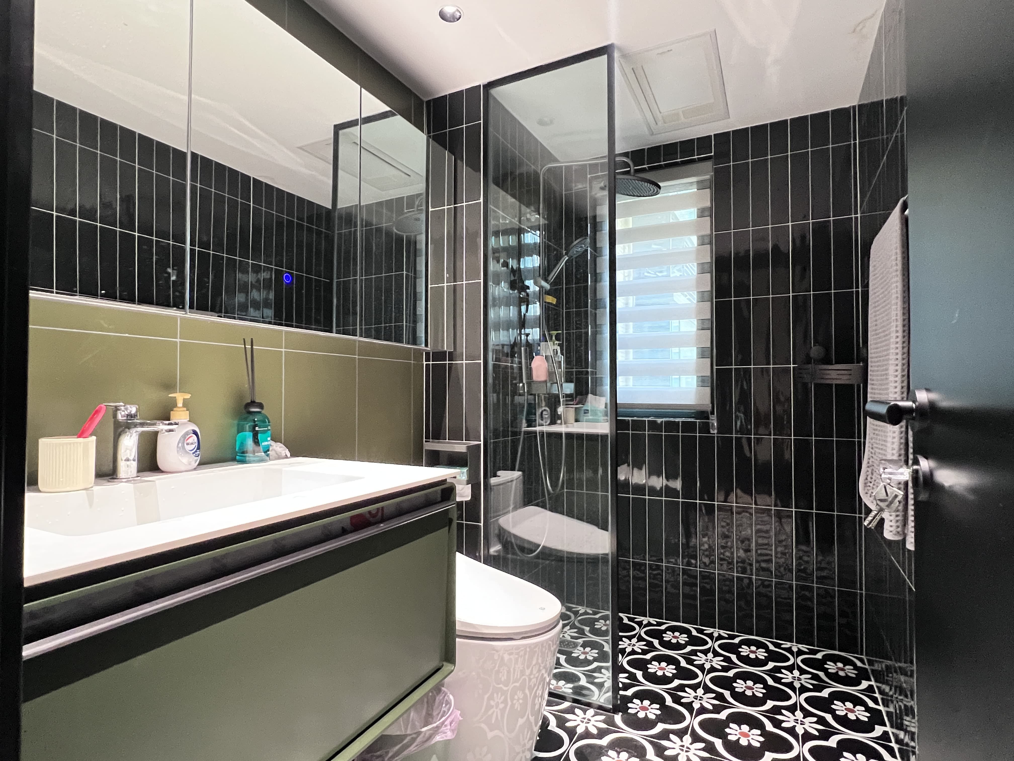 衛生間用花磚和黑色墨綠色瓷磚搭配,給人非常浪漫的感覺,生活可以簡單,但是喜歡生活的人處處可以體現對生活的用心!