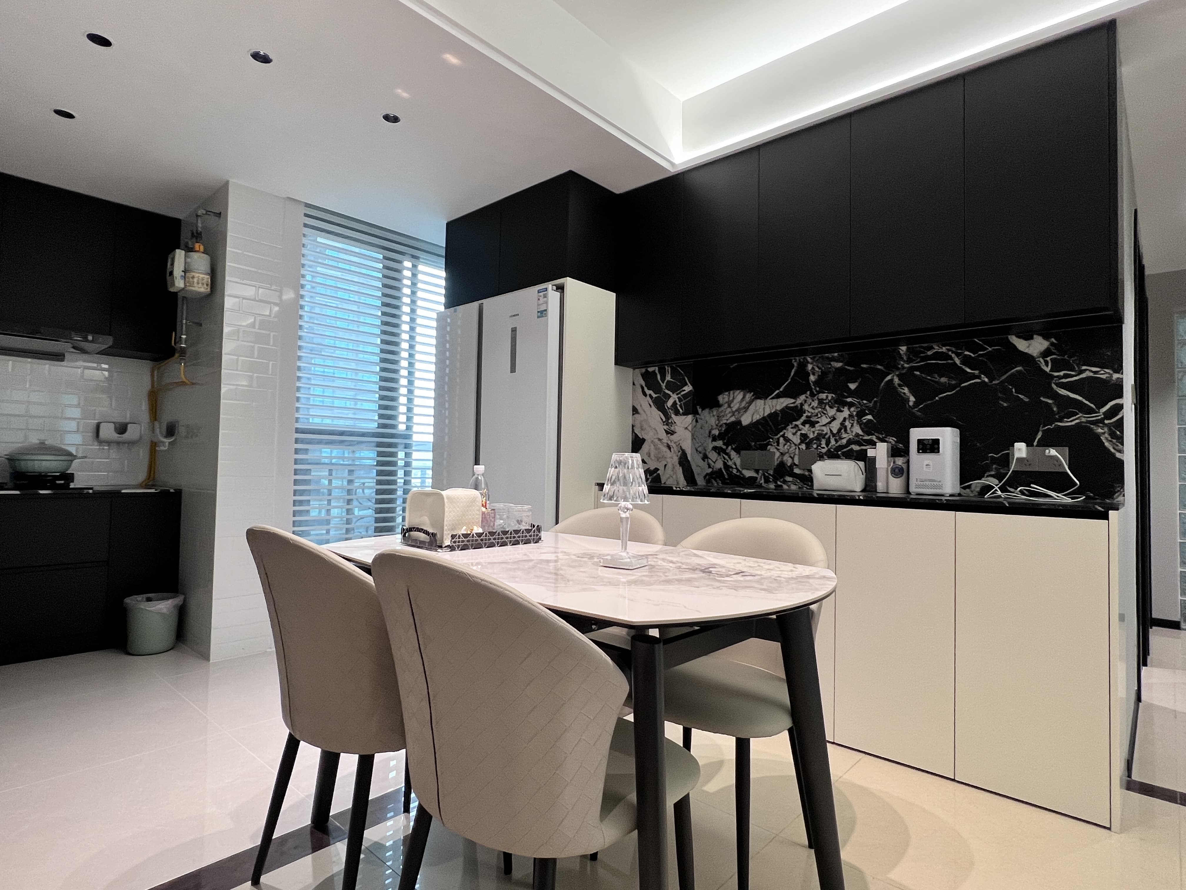 根據餐廳的面積和形狀,合理安排餐桌的布局,依靠墻面的位置做了和冰箱一體的高柜,使用方便,黑白和石材紋理搭配盡顯高級感!